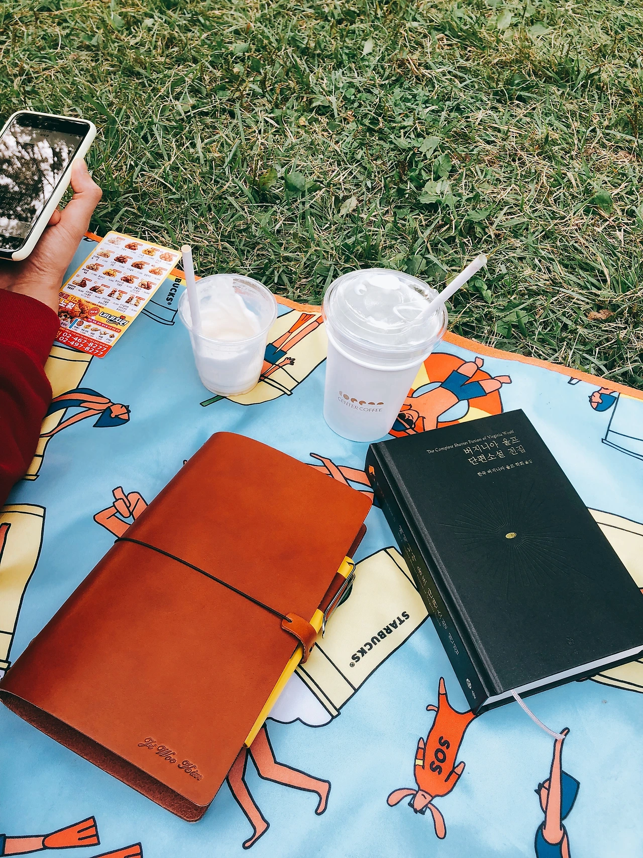 스스로에게 주는 생일선물로 각인을 새긴 헤비츠 가죽 노트 커버를 받아 들고 서울숲으로 갔다. 돗자리를 깔고 누워 과자를 까먹듯 단편소설을 하나씩 읽어나갔다. 엎드린 자세로 읽고 싶었지만 출산예정일까지 두 달 남은 뱃속 아기가 발차기를 했다. 아이를 낳고 키우며 소설을 쓸 수 있을까? 어떤 소설을 쓸 수 있을까? 까마득한 질문을 듣고 그녀가 답했다. 벽 위에 난 자국 하나로도 소설을 쓸 수 있어, 세상 모든 것이 다 소설이야. 내 머리 위 구름 속에 숨겨진 무언가로 소설 하나는 충분히 쓸 수 있지, 머릿속이 바빠지자 뱃속 아기도 따라서 춤을 추었다.