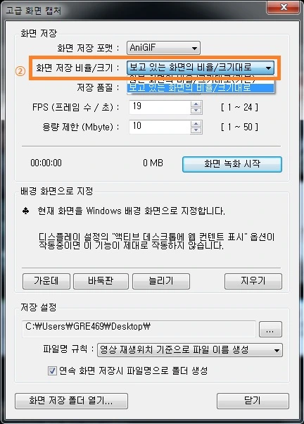 2. 화면저장 비율/크기 : 보고 있는 화면의 비율/크기대로