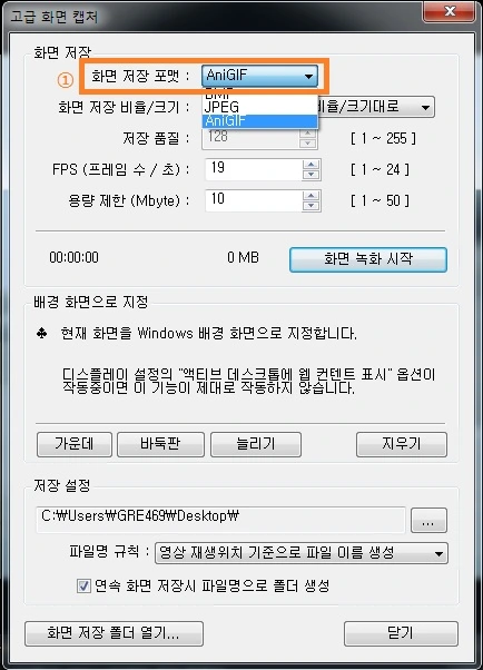 화면저장포맷을 ‘AniGIF’로 설정해 줍니다.