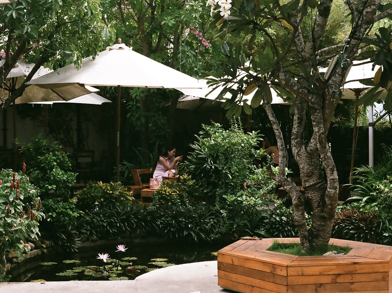[k. 대략 이런 분위기의 카페였는데, 가운데 위치한 연못에는 물고기가 물 흐르듯 움직이고 그 주위를 둘러싼 다양한 식물들은 어색하지 않게 자리 잡아있다. 특히 이곳에서 본 사람들의 여유로움은 중심지이자 관광지인 곳에서는 보지 못한 그런 특이함이었다. 꽤 인상 깊었다.]
