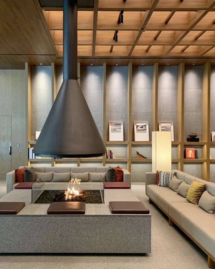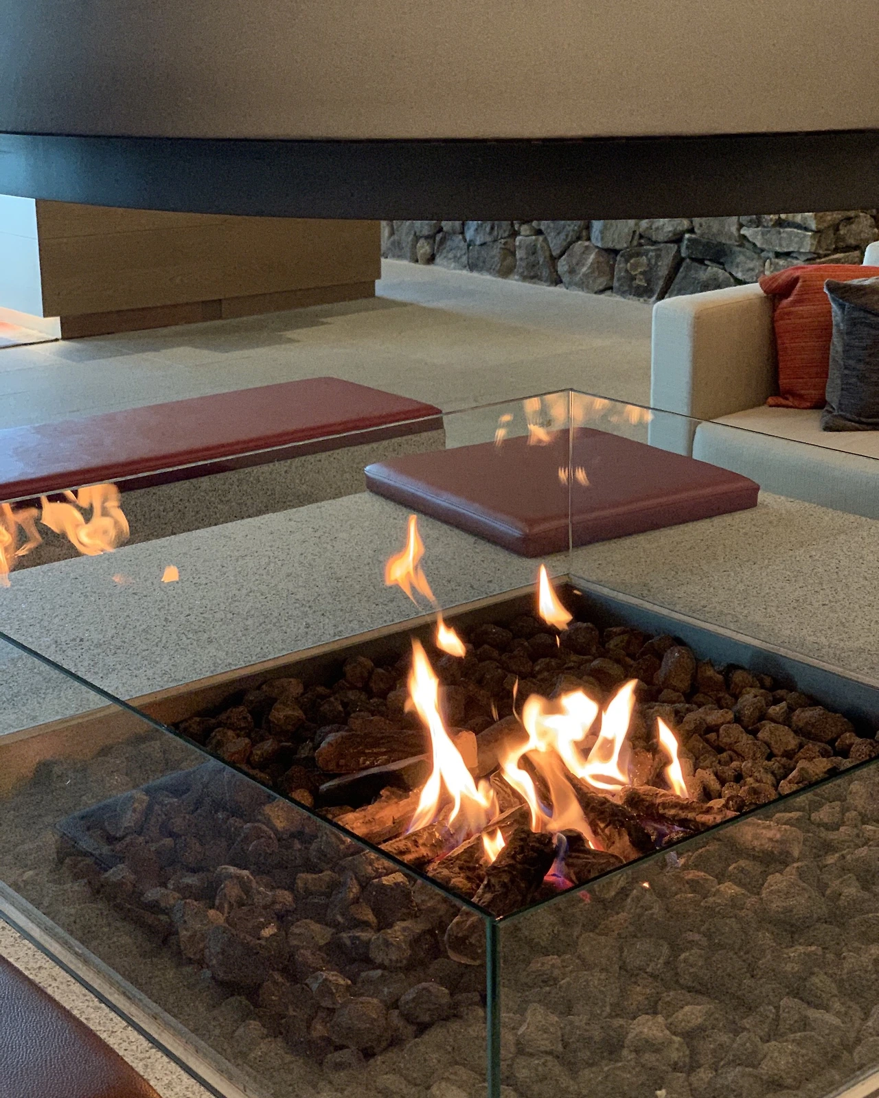 [h. 실내에도 자연의 느낌을 주는 파크로쉬에서 마음에 들었던 부분으로, 이렇게 모닥불을 볼 수 있다는 점입니다. 그리고 철 (Steel)로 된 재료를 사용하지 않고 대리석과 조약돌로 마감을 해서 불의 색감이 조금 더 자연스럽게 다가옵니다. 멍 때리기 최적입니다.]