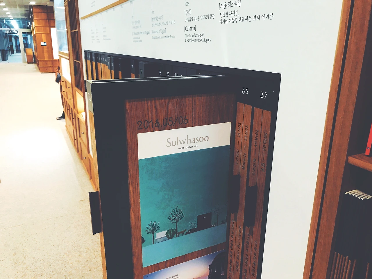 [e. 2층에는 아모레퍼시픽의 History를 체험할 수 있는 공간이 있는데 브랜드 마케팅에서부터 그동안 만들어진 제품의 연대를 확인할 수 있는 체험 공간이다. 개인적으로 정말 이런 센스는 어떻게 나오는 것일까.]