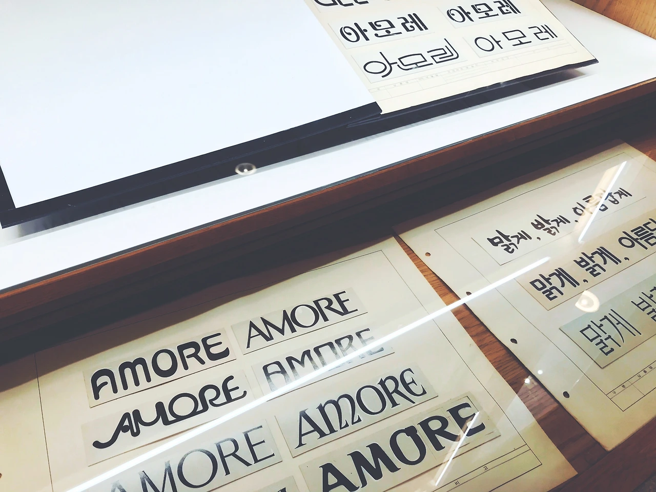 [g. 아모레퍼시픽의 처음, 아모레라는 단어에 대한 다양한 폰트 그리고 실험적인 다양화. 지금은 촌스럽게 보이겠지만 그 당시에는 꽤나 힙하지 않았을까.]