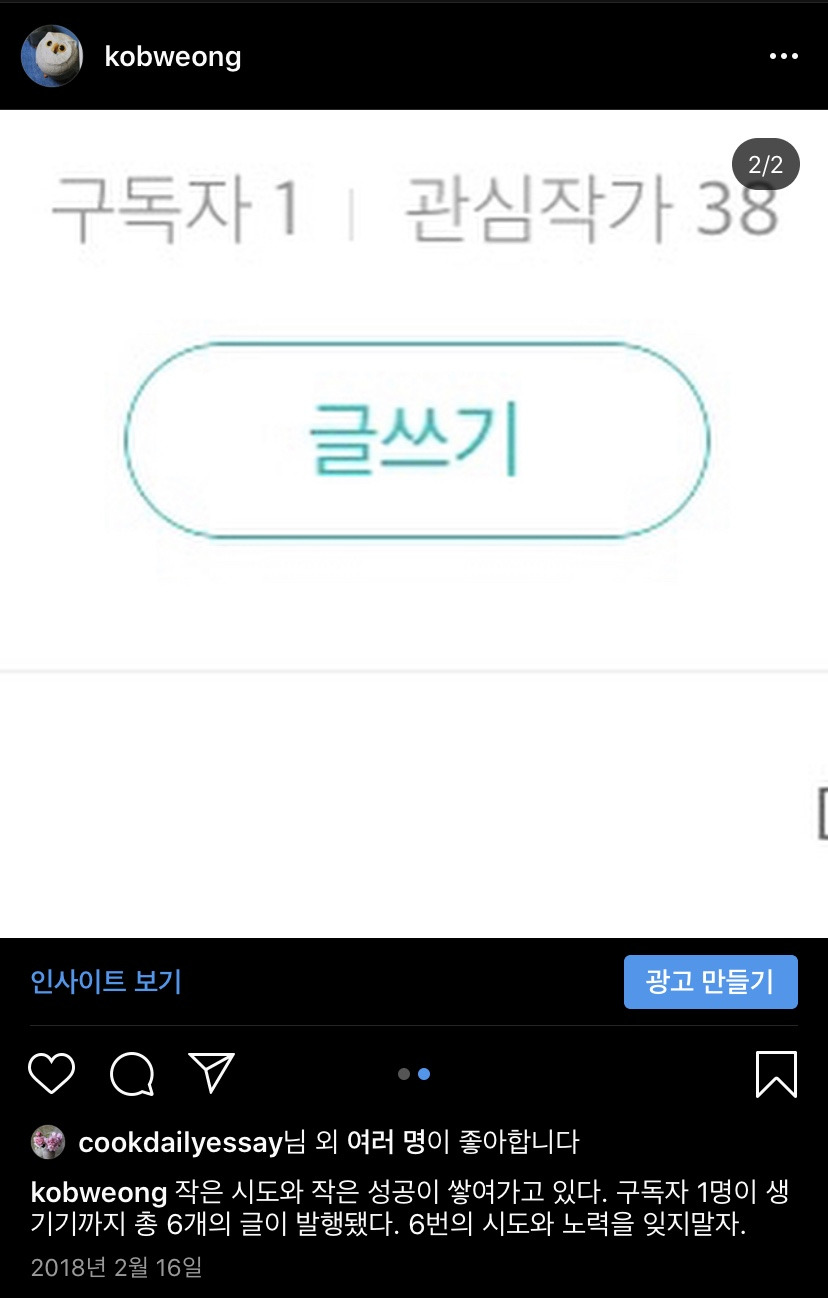 그렇게 묵묵히 6개의 글을 올렸을 때, 첫 구독자분이 드디어 생겼다..!! 그때의 기쁨이란, 말해 무엇하리. 너무 좋아서 캡처도 하고 이 순간을 잊지 않기 위해 인스타그램에도 착실히 기록해뒀다. 그리고 이 게시물은 나로 하여금 <이렇게 답도 없는 일(=글쓰기)>을 포기하지 않고 꾸준히 이어갈 수 있게 한 원동력이 되었다.