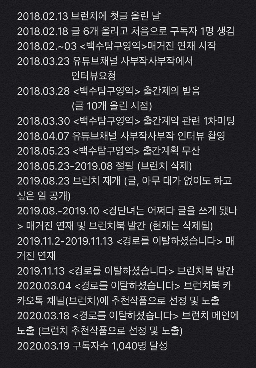 그 이후는 언제 그렇게 안 풀렸나(?) 싶을 정도로 술술 일이 풀렸다. 지금의 <경로를 이탈하셨습니다>의 전신이라고 할 수 있는 <백수 탐구영역>이라는 매거진의 연재를 시작했고, 태어나서 처음으로 인터뷰 요청도 받았고, <백수 탐구영역> 매거진에 글을 10개쯤 올린 시점에서는 한 대형 출판사로부터 출간제의 까지 받았다.