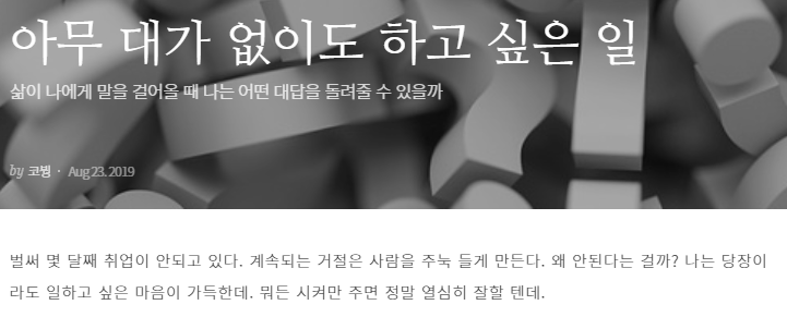 <백수 탐구영역>을 쓸 때처럼 미리 콘셉트를 잡고, 내용을 구상하고 쓴 글이 아니었다. 너무 답답한 마음에 그냥 끄적인 글이다. 그런데, 이렇게 시작한 글쓰기가 지금까지 쭉 이어지고 있다. 신기할 일이다.