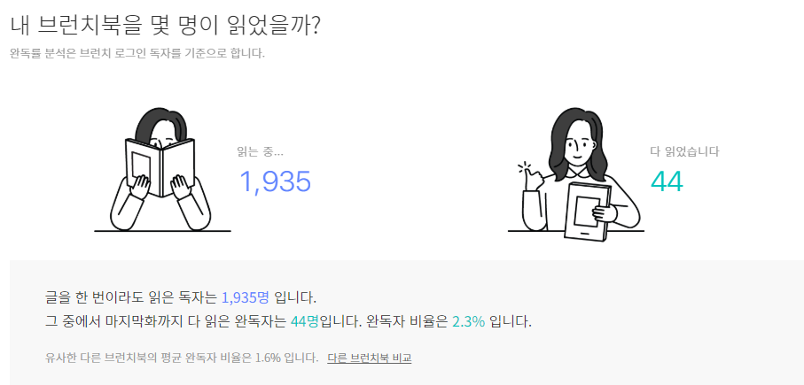 그래서 내게 제7회 브런치 북 출판 프로젝트는 한 편으론 슬프고, 또 한 편으론 기쁜 기억이기도 하다. 실제로 저 날을 기점으로 <경로를 이탈하셨습니다>는 브런치에 꾸준히 노출됐다. 덕분에 <경로를 이탈하셨습니다>는 어제(2020.03.18) 기준으로 총 1,935명에게 읽혔고, 그중 2.3%가 완독 했다고 한다. 유사한 다른 브런치 북의 평균 완독자 비율이 1.6%라고 하니 그에 비하면 준수한 수준이다. 구독자 수도 가파르게 늘어나더니 결국 어제 드디어 마의 <1,000명>을 넘어섰다..!! 2년간의 노력이 드디어 결실을 맺게 된 순간이었다.