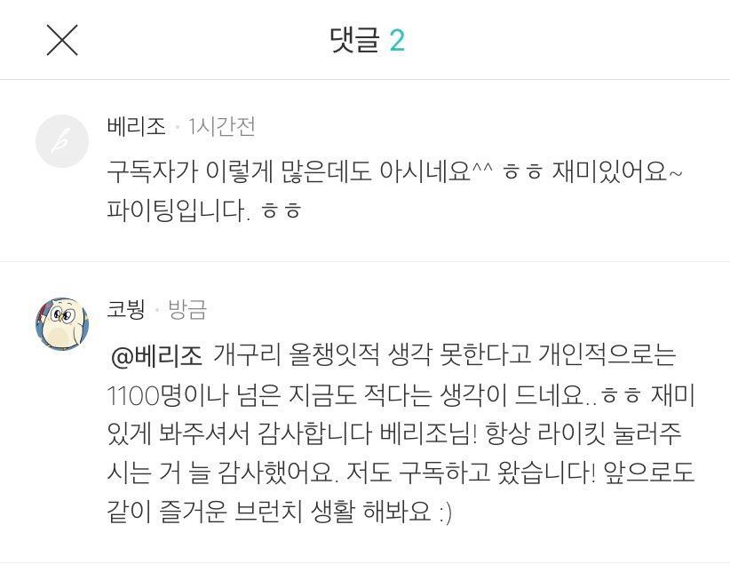 그 덕분에 약 2년간 브런치를 해오면서도 절대로 깰 수 없을 것 같았던 구독자수 1,000명을 얼마전에 겨우 달성했고, 이후로 1100여 명으로 늘어나는 건 1,000명이 되기까지 걸렸던 시간에 비하면 거의 절반. 아니 거의 4분의 1도 안 걸린 것 같다. 그 정도로 미친 듯이 쭉쭉 구독자수가 늘었다.