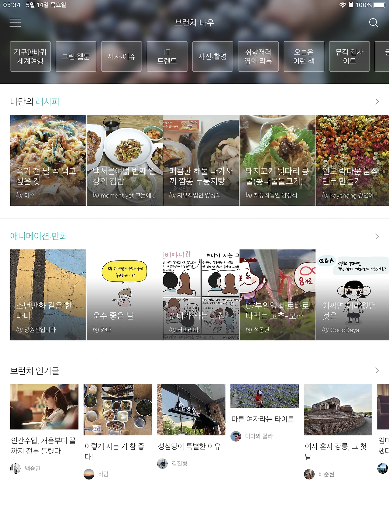 다른 글에서도 잠깐 언급했지만 나는 요즘 <브런치 나우> 메뉴를 자주 이용한다. 브런치 나우에 들어가 보면 여러 가지 카테고리별로 글들이 촤라락 펼쳐지는데, 브런치팀의 큐레이션 능력에 의문을 품고 있는 지금의 내게 있어서 그것들은 내 흥미를 그다지 끌어당기지 못한다.