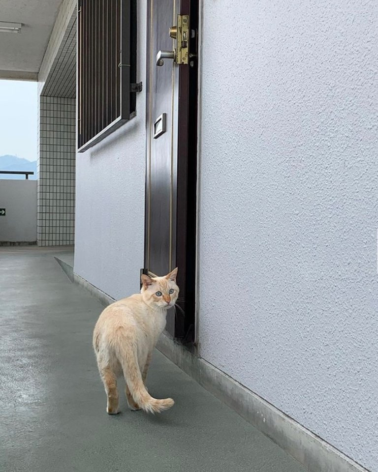 그렇게 안면을 트게 된 나비와 주인분은 그 후로도 종종 만나곤 했다. 가끔씩 주인분이 환기를 목적으로 현관문을 열어둘 때마다 나비가 집 앞 복도로 나와 서성거렸기 때문이다.
