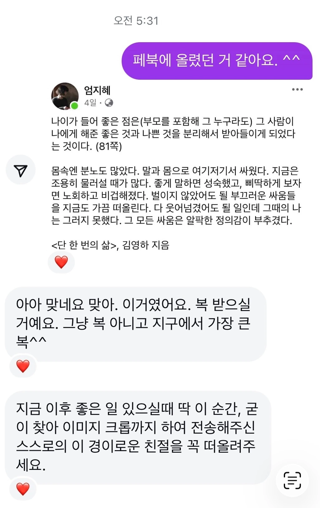 흠… 스토리에 발췌를 올린 기억은 없다고 답변을 하고 잠을 청했다. 새벽에 깼는데, 아하..내가 페이스북에 올렸었구나 떠올라서 문구를 캡처해서 보내줬더니, 회신이 재밌다.