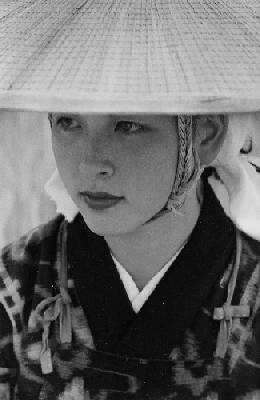 삿갓을 깊숙이 쓰고 먼 곳을 응시하는 한 농가 여인의 사진