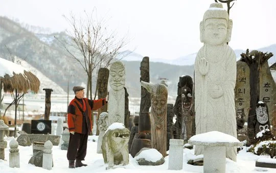 “돌이라고 하면 그냥 투박해 보이지? 돌이란 게 얼마나 세심한 재료인지 사람들은 몰라.” 민속공예가 배방남(68)씨는 그 돌을 닮았다. 조용하고 단단하다. 그가 돌장승 사이에 서면 그는 또 하나의 돌장승이었다. 손엔 돌처럼 딱딱한 굳은살이 잔뜩 박였다. 석공으로 산 세월이 자그마치 반백년이다.