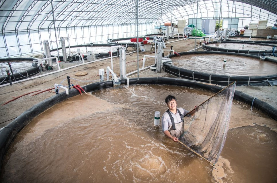 그는 바이오플락(미생물을 활용한 수산물 양식법)이라는 기술로 새우를 키운다. 미생물을 통해 사료 찌꺼기나 배설물에서 발생되는 오염물을 분해하는 게 바이오플락 기술의 핵심이다. 천 대표는 "물갈이가 필요없는 게 장점 중 하나다. 한번 물을 넣어주면 새우가 다 자랄 때까지 물을 바꿔주지 않아도 된다"고 했다. 미생물이 알아서 오염물을 분해하기 때문이다. 미생물 덕에 사료 양이 줄어들고 배설물이 쌓이지 않는다. 성장이 빨라 생산량이 늘고 연중 출하가 가능하다.