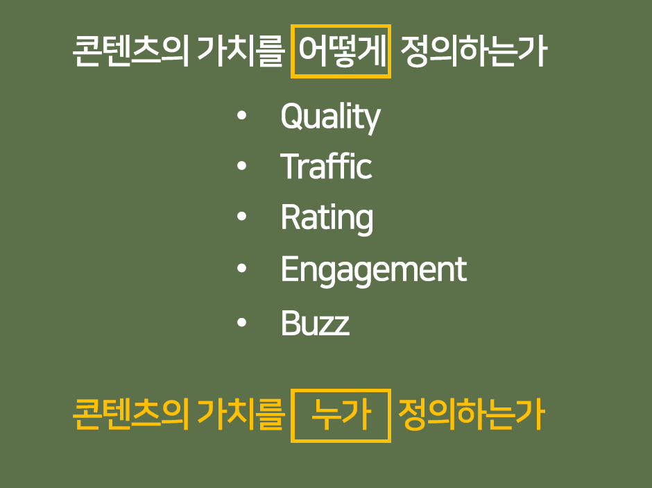 이제 하나의 가치 척도로는 콘텐츠 가치 표현이 불가능한 상황에서 어떤 척도를 선택하는 것이 가장 옳은 결정일까요. 정답이 없기 때문에 다른 관점에서 바라볼 필요가 있습니다. 가치 척도를 "누가" 정의하는 것이 옳은가를 먼저 살펴봐야 합니다.