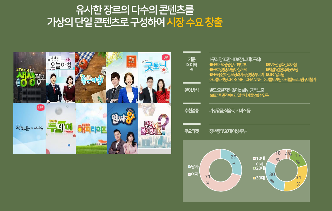 콘텐츠 타겟팅은 특정 콘텐츠에만 국한되지 않습니다. 트래픽이 저조하더라도 유사한 장르간의 그룹핑을 통해 규모있는 하나의 콘텐츠로 운영하는 것이 가능합니다. 아침 정보 콘텐츠들을 모두 모아서 가정용품 광고주나 주부를 타겟으로 하는 광고주의 수요을 창출하고, 종편의 건강 정보 콘텐츠들을 모두 모아서 제약 광고주나 식음료 광고주에게 소구하는 것도 가능합니다.