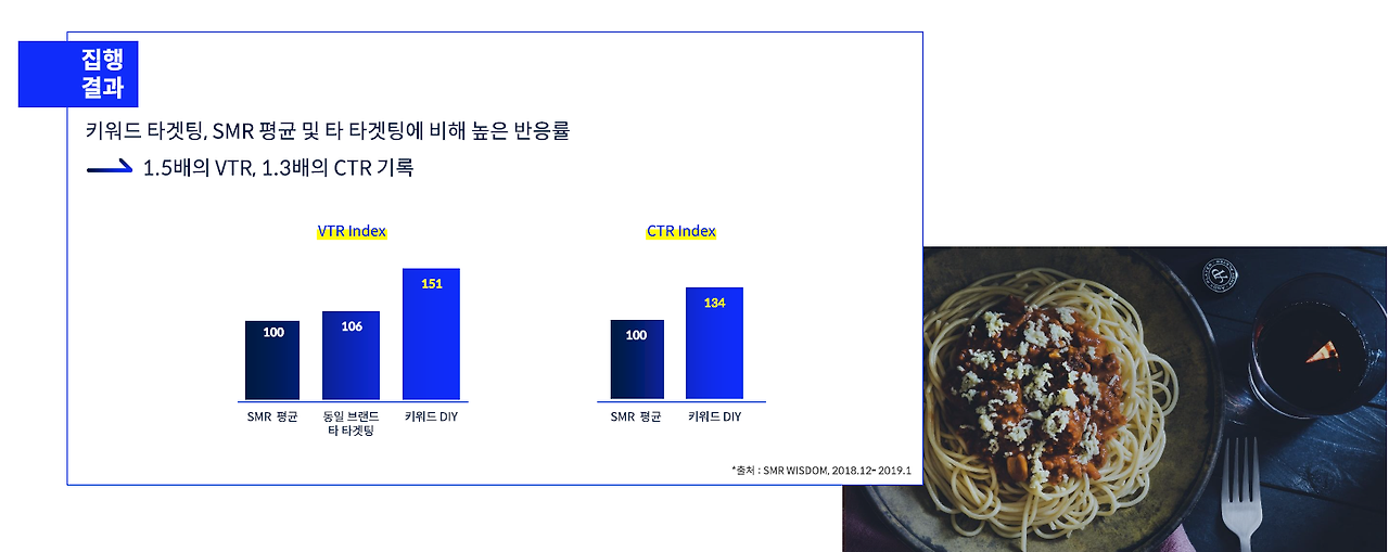 또 다른 사례는 파스타 소스 브랜드였는데, 모델 이슈보다는 음식, 요리와 관련된 키워드를 다량으로 구매했었습니다. 키워드 VTR 은 평균 대비 1.5배를 넘어섰고, VTR과 CTR이 함께 상승하는 결과를 보였습니다. 보통 VTR이 오르면 CTR 이 상대적으로 낮아지는 경향성을 띄는데, 광고와 영상의 강력한 연결고리가 있을 때는 다른 양상을 보인다는 사례였습니다.