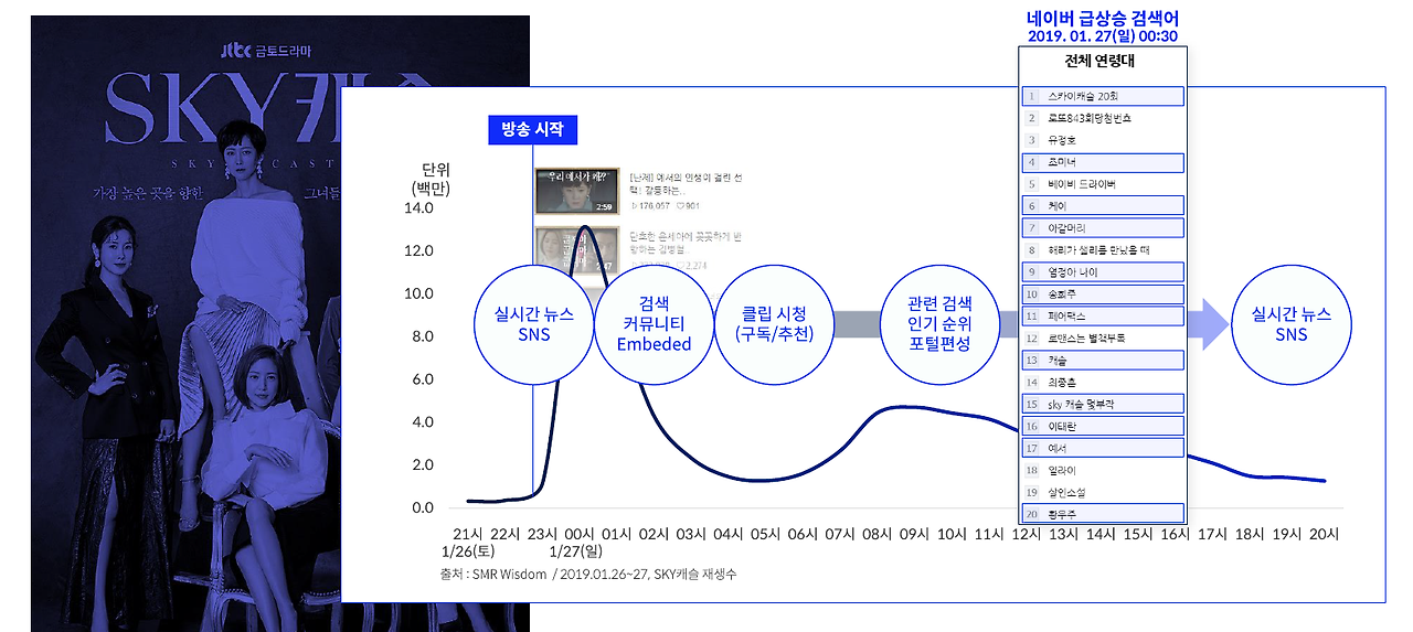 SMR의 가장 큰 특징 중 하나는 바로 트래픽의 시의성입니다. 방송콘텐츠가 만들어내는 트래픽의 패턴은 매우 폭발적입니다. 최근 20화를 마지막으로 19화를 마지막으로 종영한 SKY캐슬의 경우를 보죠. SKY캐슬은 금토 23시에 편성됐습니다. JTBC는 아주 빠른 속도로 클립을 편집해서 SMR에 업로드합니다. 썸네일도 미리 편집할 정도로 공을 많이 들입니다. 방송이 끝난 직후에 네이버, 카카오TV 에 들어가 보면 이미 방금 끝난 회차의 클립이 업로드되어 있습니다. 업로드 직후부터 트래픽이 폭증하기 시작합니다.
