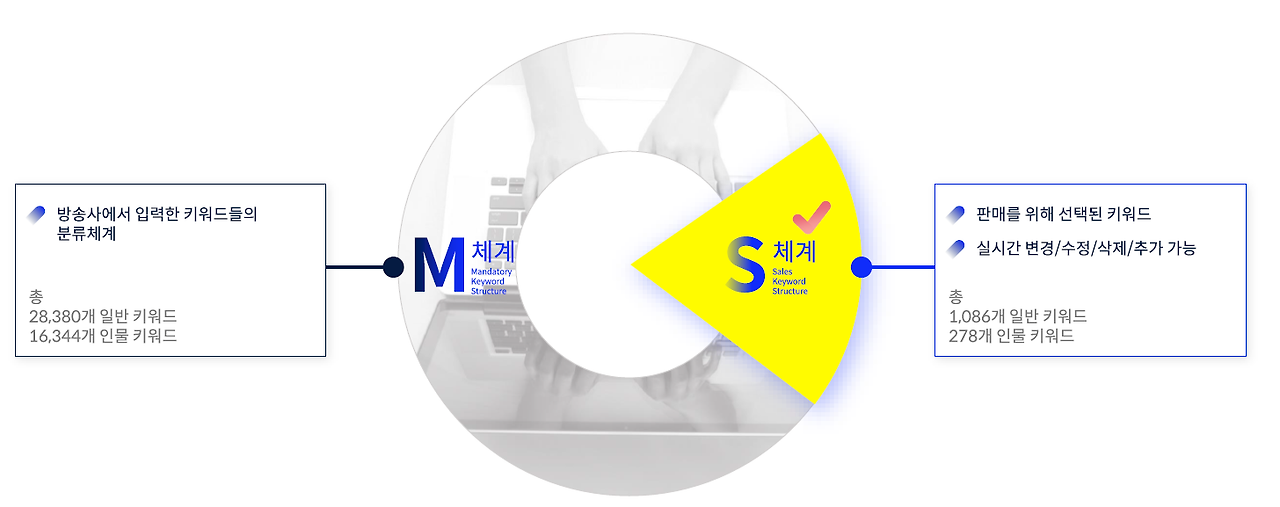 무수히 많은 일반 키워드는 대분류-중분류-소분류로 구분합니다. 이 키워드 체계는 2가지로 구분됩니다. 방송사에서 직접 입력한 M 체계. 그리고 SMR 플래닝팀에 의해 카테고리화 되고 트래픽 예측이 가능한 키워드를 필터링한 S 체계. M 체계에서는 상업성의 유무를 떠나 무수히 많은 단어들이 입력되기 때문에 이들을 보다 효율적으로 판매하기 위해서 S체계라는 필터를 거친다고 이해하면 됩니다.