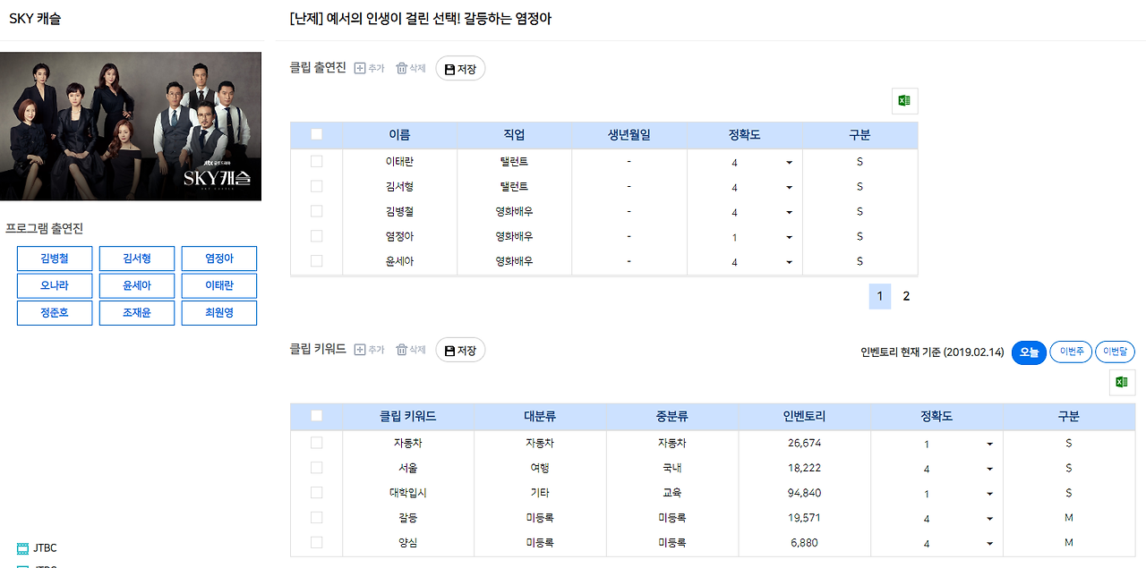 지금 보여드리는 화면은 KISS라는 SMR의 키워드 관리 시스템입니다. 위 장면에 포함된 주요 키워드들을 살펴볼 수 있습니다. 일단 인물 키워드에서는 염정아 씨가 가장 높은 정확도로 입력되어 있고요. 아래 일반 키워드를 살펴보면 자동차, 대학입시, 갈등, 양심 등과 같은 단어가 포함됩니다. 여기서 <랜드로버>라는 키워드를 넣어보죠. (서밋 현장에서 랜드로버를 입력하는 시연이 있었습니다.)