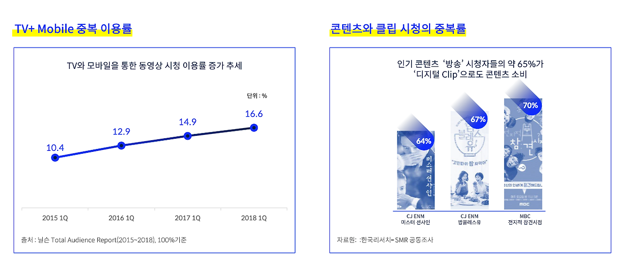 여기 계신 여러분들도 비슷한 경험이 있을 겁니다. 혜나가 비극적으로 죽음을 맞았을 때나, 홍탁 집 아들이 사실은 꽤나 훌륭한 소상공인이었다는 것을 역설적으로 깨닫게 됐을 때의 그 감정들. 그것들을 확인하고, 동의받기 위해서, 댓글을 보거나, 댓글을 달거나, 연예 뉴스를 다시 읽거나, 영상을 다시 보거나 하는 행동들 말이죠. 이 행동들은 콘텐츠를 중심으로 아주 비슷한 시간대에 비슷한 패턴으로 균일하게 나타납니다. 마치 함께 시청을 하는 것처럼 말이죠. 관련된 조사는 이전에도 많이 있었습니다. 닐슨의 기존 조사에서도, SMR과 한국리서치의 공동 조사에서도 나타나듯 TV와 모바일의 중복 이용은 이미 여러 차례 검증된 사실입니다.