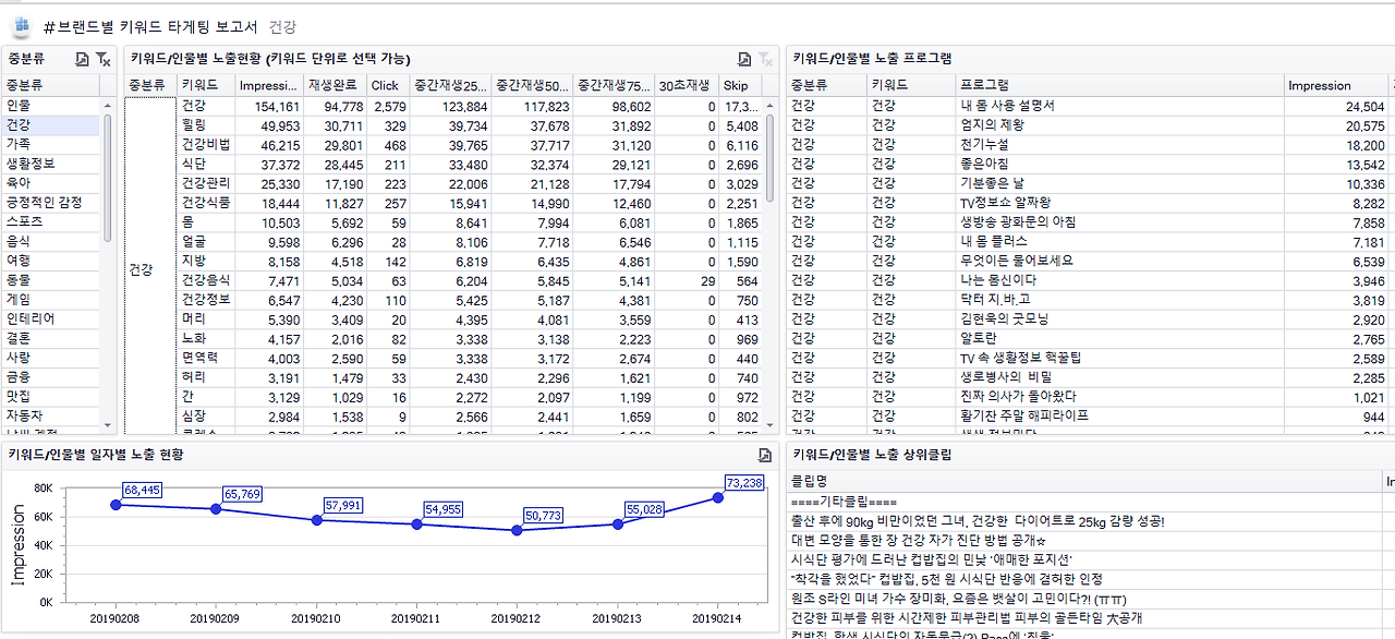 관심사 타겟팅은 영상을 분류하는 것이 아니라 시청자를 분류하는 것에 가깝죠. 정교한 로직이 있겠지만 어쨌든 추정에 근거하는 것이고 그 디테일을 눈으로 확인하는 것 또한 쉽지 않습니다. 반면, 키워드 타겟팅은 물리적으로 그 키워드가 존재하는 영상 그 자체를 타겟팅합니다. 현장에서는 못 보여드렸지만 아래 이미지는 SMR Wisdom을 통한 키워드 분석 화면입니다. 어떤 콘텐츠와 어떤 클립들을 통해서 어떤 키워드에서 얼마만큼의 노출과 효과가 있었는지 직접 보면서 검증할 수 있습니다.