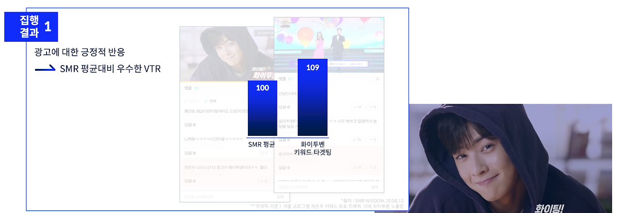 모 제약 브랜드의 광고 모델은 얼굴 천재 차은우였습니다. 이 브랜드는 차은우라는 인물 키워드와, 건강, 날씨와 같은 일반 키워드 타겟팅을 병행했습니다. 특히 차은우가 등장하는 쇼, 예능 프로그램의 인벤토리를 아주 높은 수준으로 점유할 수 있었습니다. 간단히 표현하면 이런 거죠. 클립 썸네일에 차은우가 있어서 눌렀는데, 광고부터 차은우가 등장합니다. 콘텐츠와 광고가 끈끈하게 조합됐을 때, VTR의 상승을 확인할 수 있었고, 영상의 댓글창에서도 브랜드를 긍정적으로 언급하는 사례가 크게 늘어났습니다.