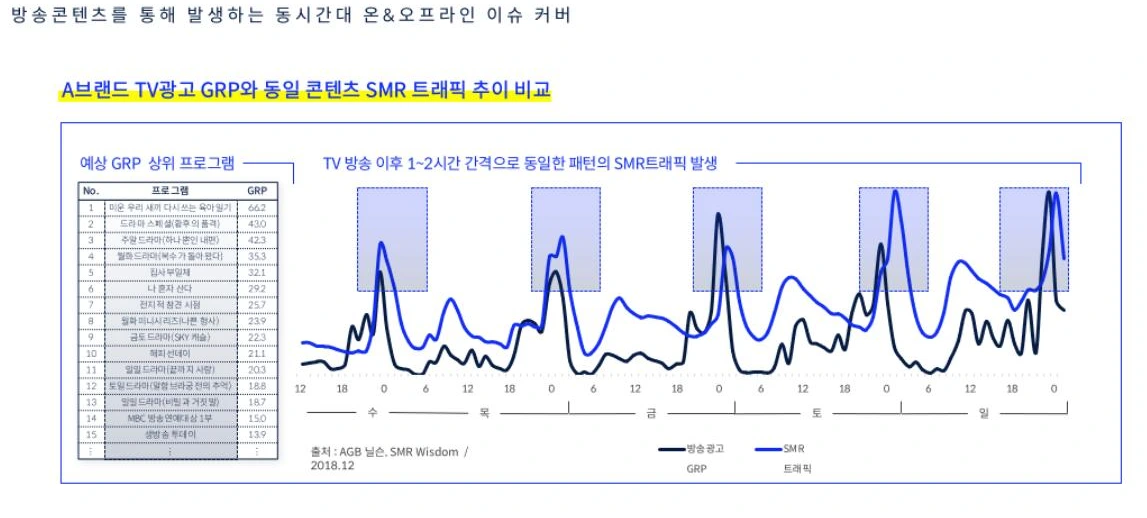 다양한 방송채널을 통해서 주력으로 구매한 프로그램의 리스트와 방송광고가 집중되는 GRP 확보 스케줄을 SMR에 제공해주는 것이죠. 그와 동일한 패턴으로 SMR의 콘텐츠 트래픽을 제공합니다. 즉, 방송광고의 GRP 스케줄을 약 한 시간 정도의 딜레이를 두고 그대로 따라가는 SMR 임프레션 스케줄을 만들게 되는 거죠.