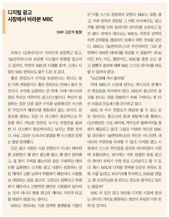 혹시 MBC의 디지털 전략을 단순히 유튜브 조회수를 늘리고, WAVVE에 투자하고, SMR을 만들고, 웹오리지널을 잘 만드는 정도로 생각하고 있지는 않나요. MBC 의 모든 광고 자산을 디지털 시장에 준하는 데이터 가치로 환원하는 것만이 유일한 미래 전략입니다.