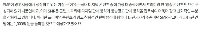 디지털 판매 방식과 방송광고 판매 방식의 접목, 이 부분은 SMR이 가장 고민했던 부분인데 잘 짚어주셨고, SMR의 성장 이유도 가장 간결하게 정리해주신 것 같아 인용했습니다.