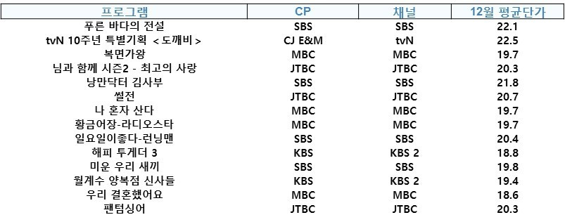 물론 <맨인블랙박스>가 발생시키는 트래픽은 상위권 드라마와 비교할 바는 안되기 때문에 단가만 보고 비교하는 것은 무리가 있습니다. 예상컨대 CJE&M의 <겟잇뷰티>가 새로운 시즌을 시작한다면 아마도 가장 높은 낙찰가는 여기서 나올 것 같습니다.