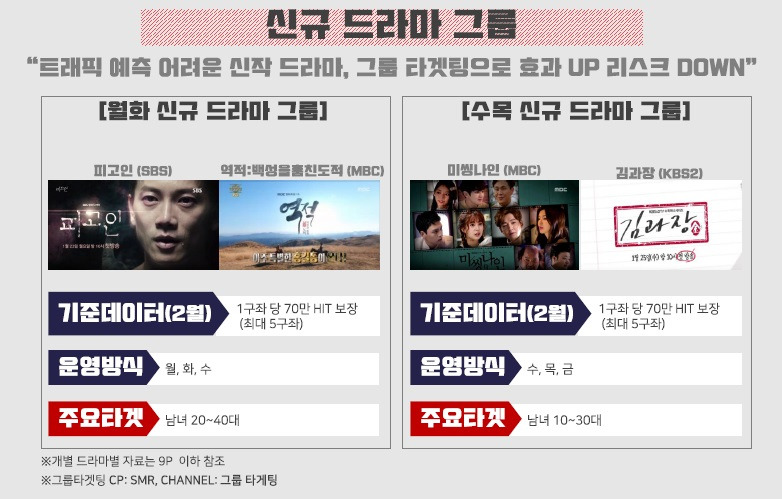 이렇게 트래픽이 저조하거나 종영된 경우보다도 판매하기 어려운 콘텐츠는 바로 '온에어되지 않은 신규 드라마'입니다. 미니시리즈 중심의 국내 드라마 환경은 노출량을 보장하는 예약형 상품과는 궁합이 좋지 않죠. 트래픽 예측이 굉장히 어려운데요, 예측 실패로 인한 SMR의 운영 리스크와 광고주의 콘텐츠 점유효과 감소 리스크를 최소화하기 위해, 올해 2월부터는 신규 드라마들만 묶어서 판매하는 상품 선보였습니다.