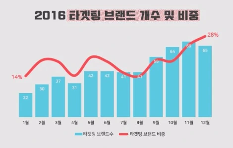 실제 2016년도 타겟팅 브랜드의 수와 비율을 보면 9월 이후 증가세가 뚜렷하게 나타났습니다. 7월은 첫 도입이었기 때문에 비딩 로직에 대한 적응 시기였고, 8월은 올림픽 특수로 정규 콘텐츠에 대한 니즈가 약했기 때문이라고 판단합니다. 전체 브랜드 중 타겟팅을 한 브랜드의 비율만 보너다도, 콘텐츠 타겟팅은 2배 이상 성장한 셈이죠.