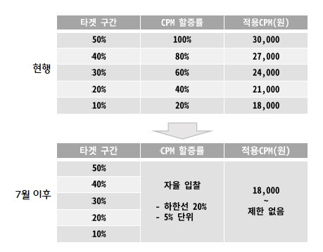 7월부터는 정률형 입찰 제도가 자율 입찰로 변경됩니다. 콘텐츠에 대한 광고주의 니즈와, 시장 상황에 따라 합리적인 가격으로 콘텐츠를 타겟팅 할 수 있게 됩니다.