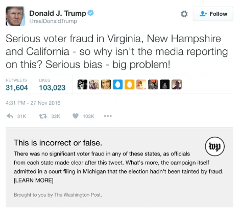 워싱턴포스트의 기자인 Philip Bump가 출시한 크롬 브라우저 플러그인이다. 도널드 트럼프의 트윗을 클릭하면 하단에 그 트윗에 대한 워싱턴 포스트의 팩트체킹 결과를 요약하여 보여준다. 해당 트윗이 불확실하거나 잘못되었거나, 중요한 맥락이 빠져있거나 또는 완전히 거짓말인지를 보여주고, ‘더보기’를 누르면 워싱턴포스트의 해당 기사로 넘어갈 수 있다. 이 서비스는 워싱턴포스트가 수행한 팩트체킹 결과만을 보여준다는 한계가 있지만(Machkovech, 2016) 트럼프의 발언에 대한 사실 확인 결과를 추적하는 데에는 매우 유용한 배포 방법이다.