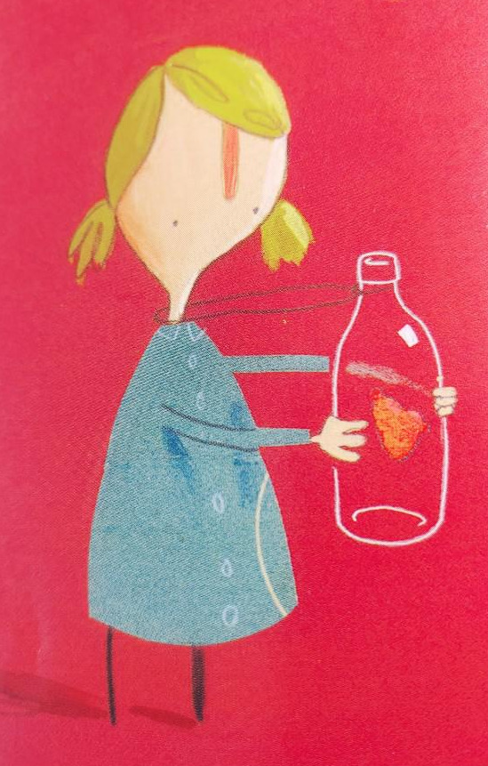 그림책 속의 소녀는 망치로 병을 부숴보기도 하고 톱으로 썰어보기도 한다. 높은 데서 떨어뜨려보기도 한다. 어떤 방법을 써도 마음이 담긴 유리병에는 금 하나 가지 않았다. 그래서 그 마음을 결국 못 꺼냈냐고? 그랬음 이건 아이들이 읽는 그림책답지 않잖아? 마음은 유리병에서 나와 다시 그 소녀의 가슴으로 돌아갔다. 어떻게 꺼냈냐고? 누군가의 도움을 받았다. 마음을 꺼내고 싶게 만든 사람이었다. 소녀의 어린 시절을 닮은 꼬마 아이. 그 아이가 유리병에서 소녀의 마음을 꺼내 줬다. 그 작은 손을 유리병에 넣어서 마음을 쏙 빼줬다.