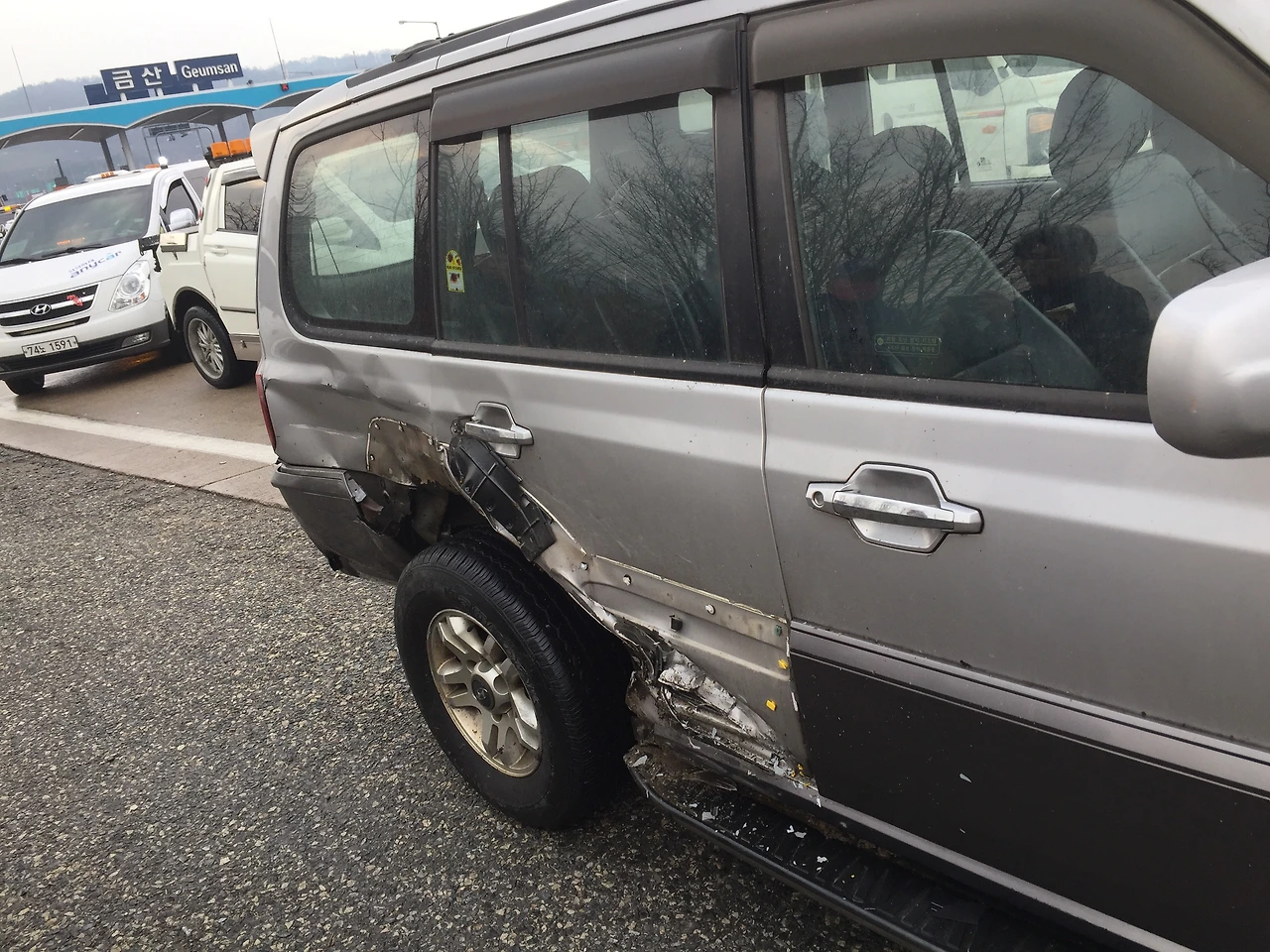 2차선 위에서 앞차의 사고 때문에 멈춰서 있던 테라칸 차의 오른쪽 뒷바퀴 바로 앞쪽을 들이받았다.