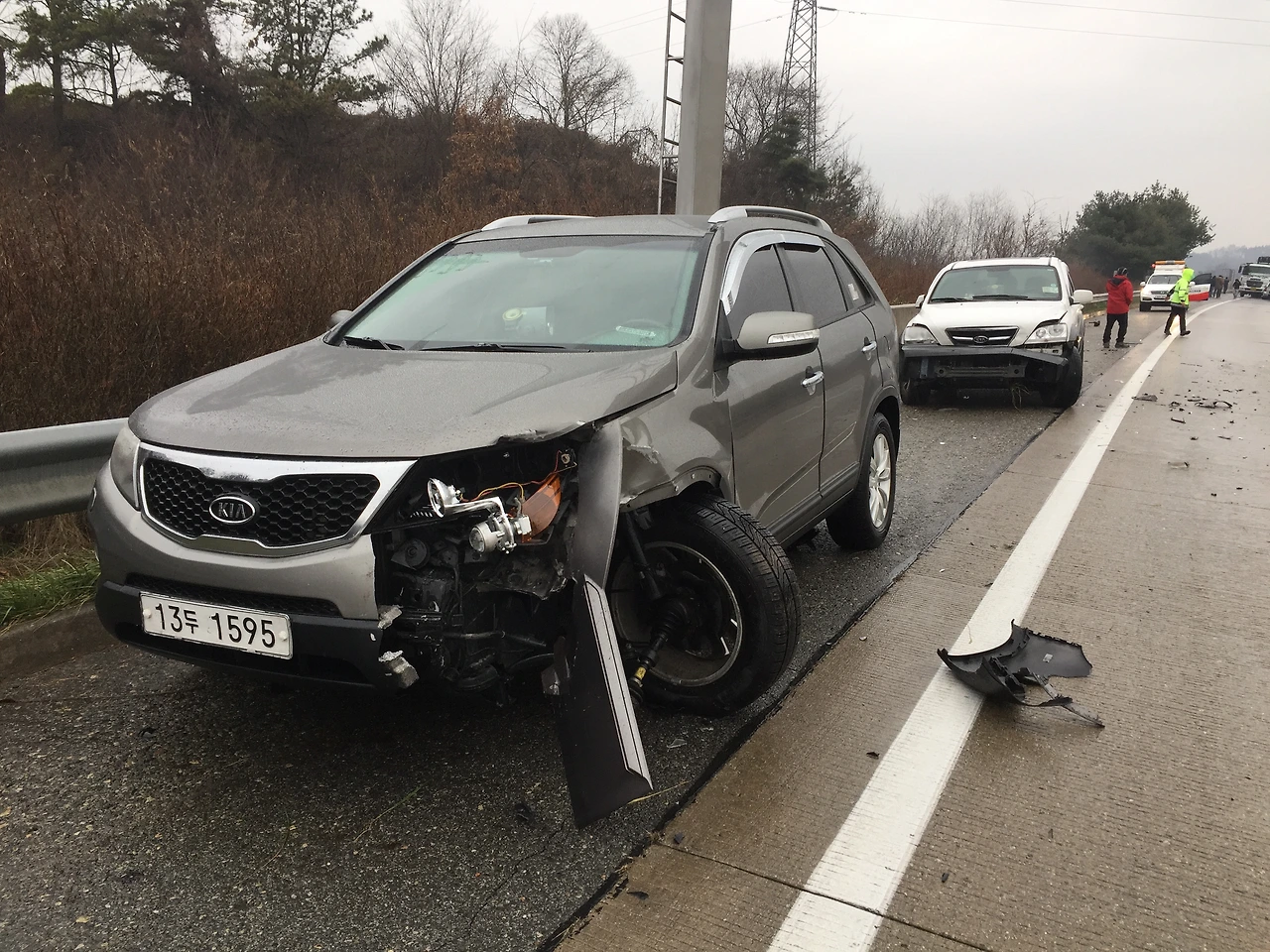 내차는 다행히 갓길에 멈춰 섰는데 운전석 쪽 바퀴가 충격에 이탈되어 옆으로 삐져나와 있었다.