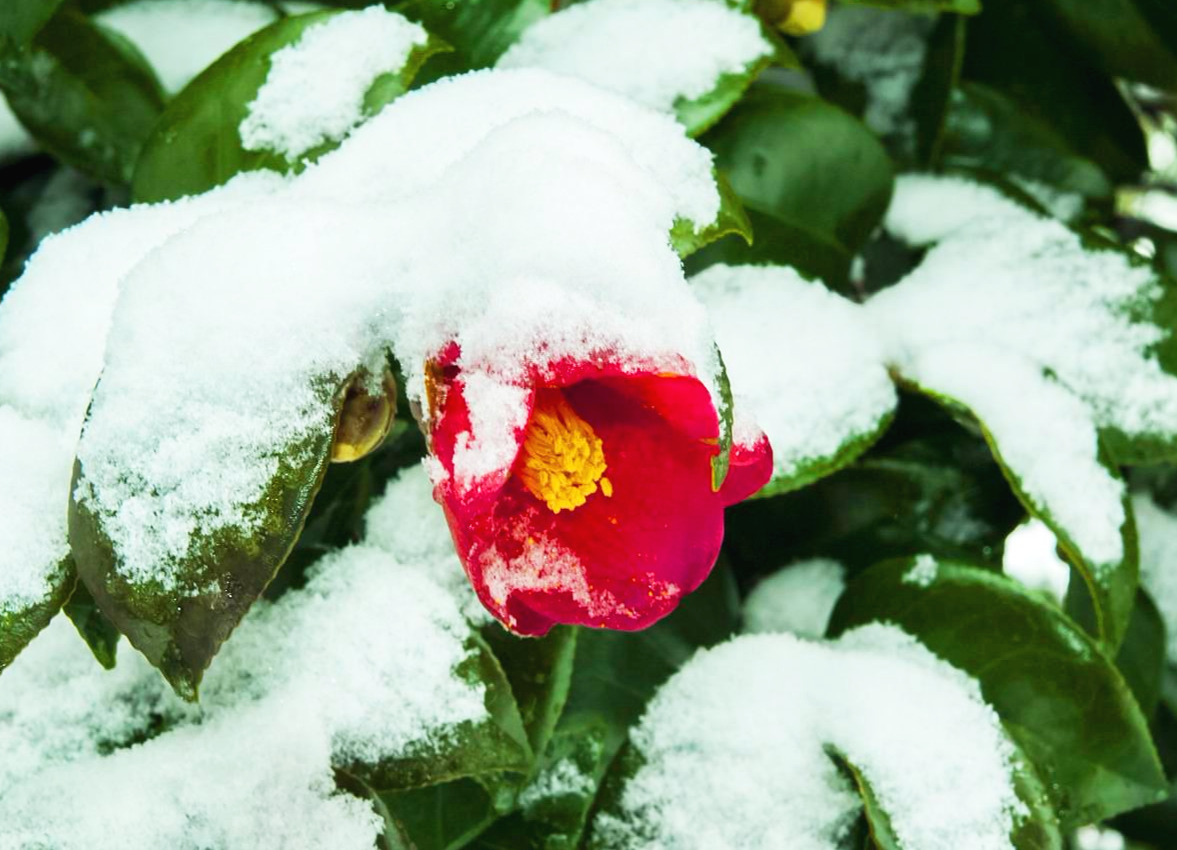 하얀 눈과 붉은 꽃 그리고 녹색 잎이 대비되어 아름다움을 뽐내고 있습니다.