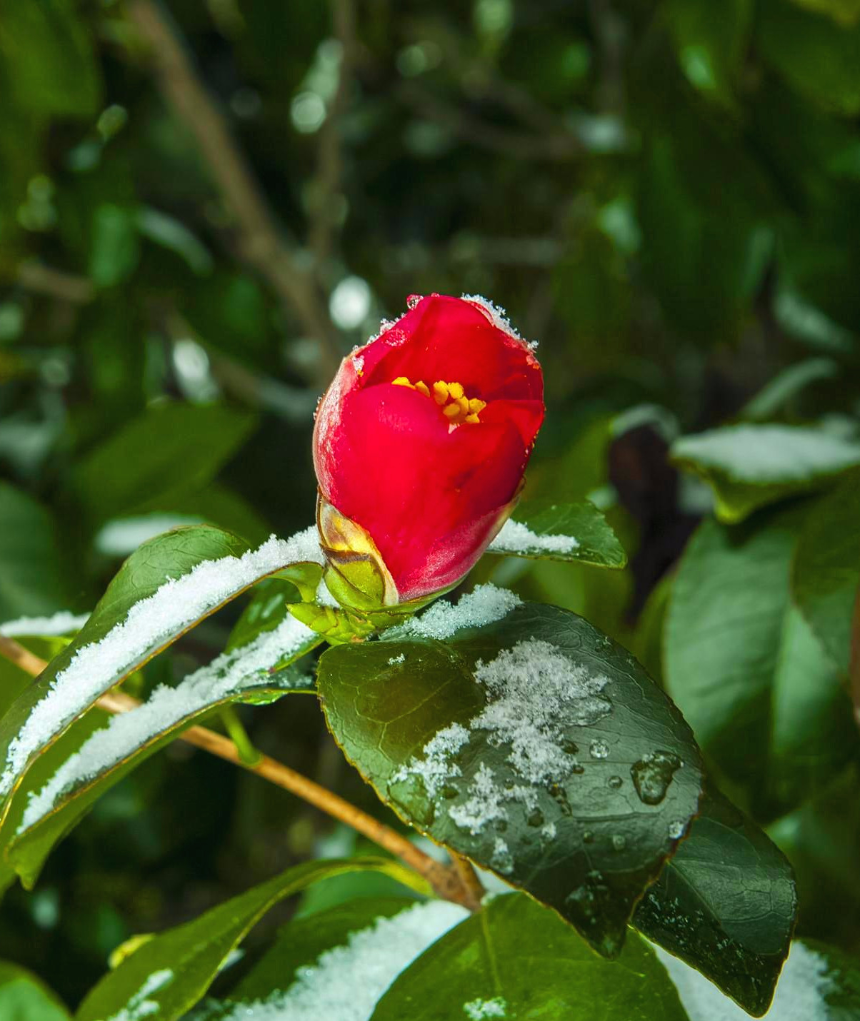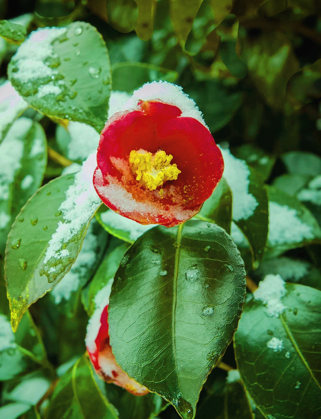 그래도 붉은 꽃 속에 노란 꽃술이 아름답습니다. 눈과 추위 속에서도 자태를 잃지 않고 붉게 피어난 의지가 아름답습니다.