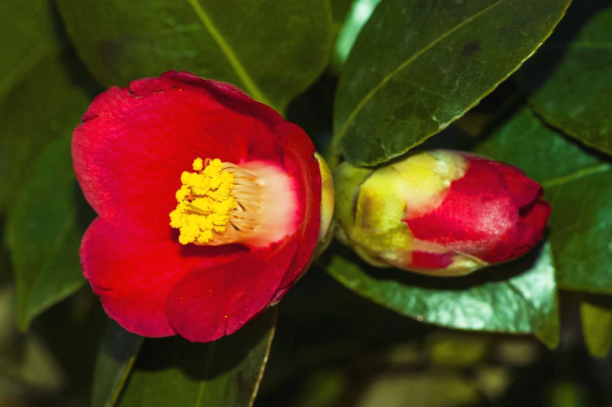 예쁘게 만개한 동백꽃 노란 꽃술에 길게 나온 수술이 보입니다.