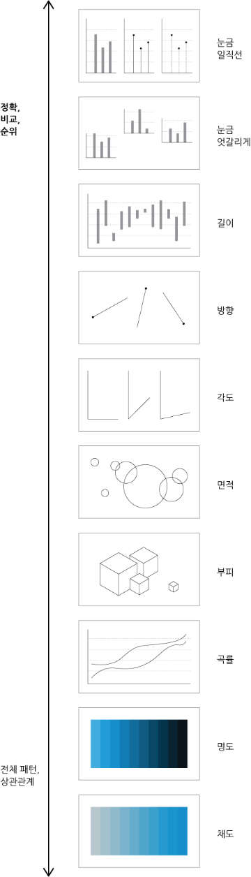 그래프에서 위로 갈수록 독자들은 더 정확한 판단을 내릴 수 있습니다. 반대로 아래로 내려 갈수록 정확한 비교나 순위 결정보다는 총괄적인 패턴이나 각 변인과 지리적 위치 간의 관계를 파악하기 쉽습니다. 이처럼 정보디자인의 목적(정확한 정보를 이해시키기 위함인지 아니면 전반적인 상황이나 관계를 이해시키기 위함인지)에 따라 데이터를 그래프 또는 히트맵 등으로 표현하면 좋습니다.