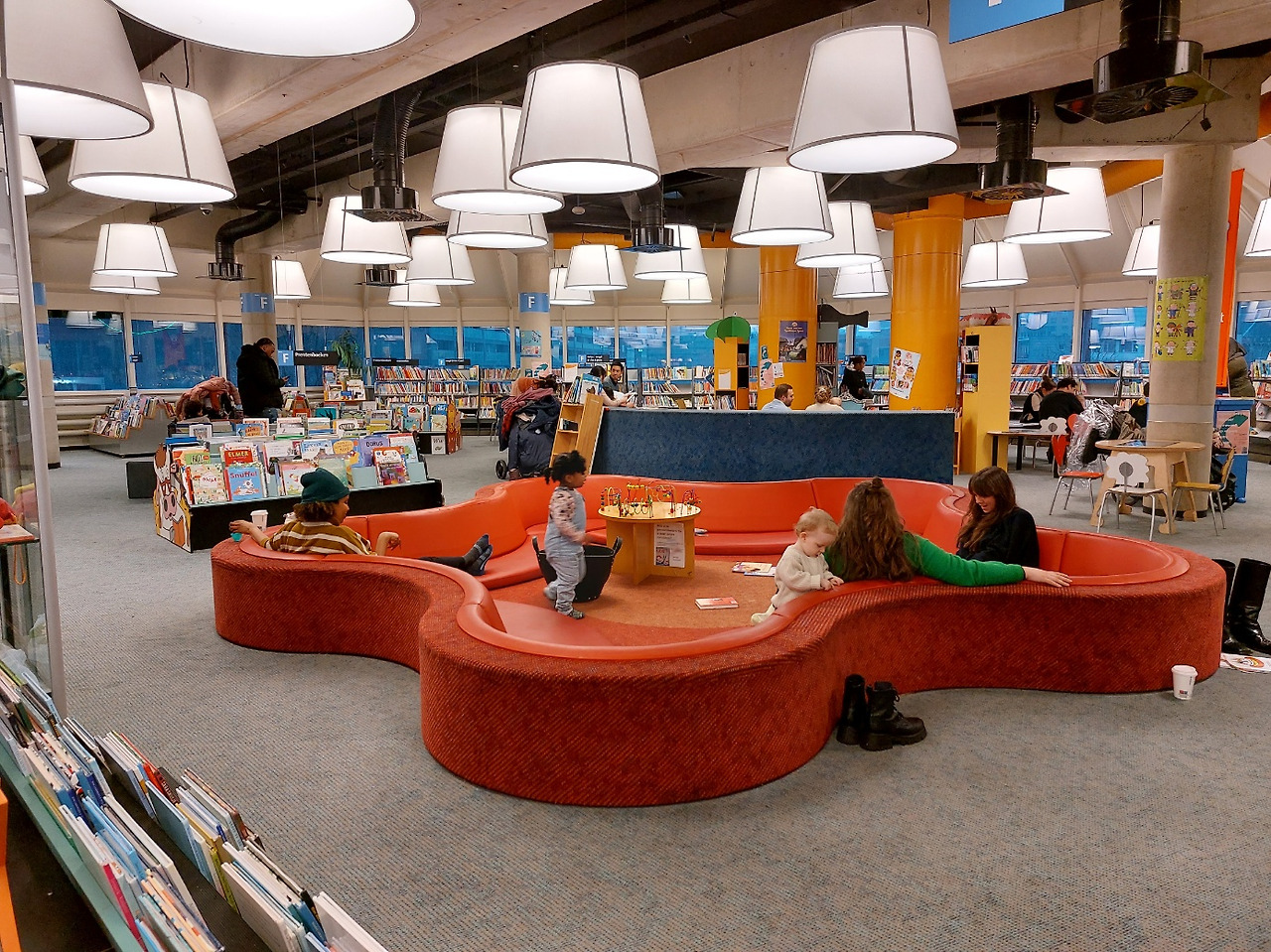 아이들을 데리고 온 엄마들이 독특한 모양의 붉은 소파에 앉아 아이들을 보며 그림책도 읽히고, 교구로 놀이학습을 할 수 있게 해 놓은 공간도 인상적이었다. 소파가 울타리처럼 되어 있어 엄마들이 휴식을 취하면서 아이들을 안전하게 돌볼 수 있는 멋진 공간이었다.
