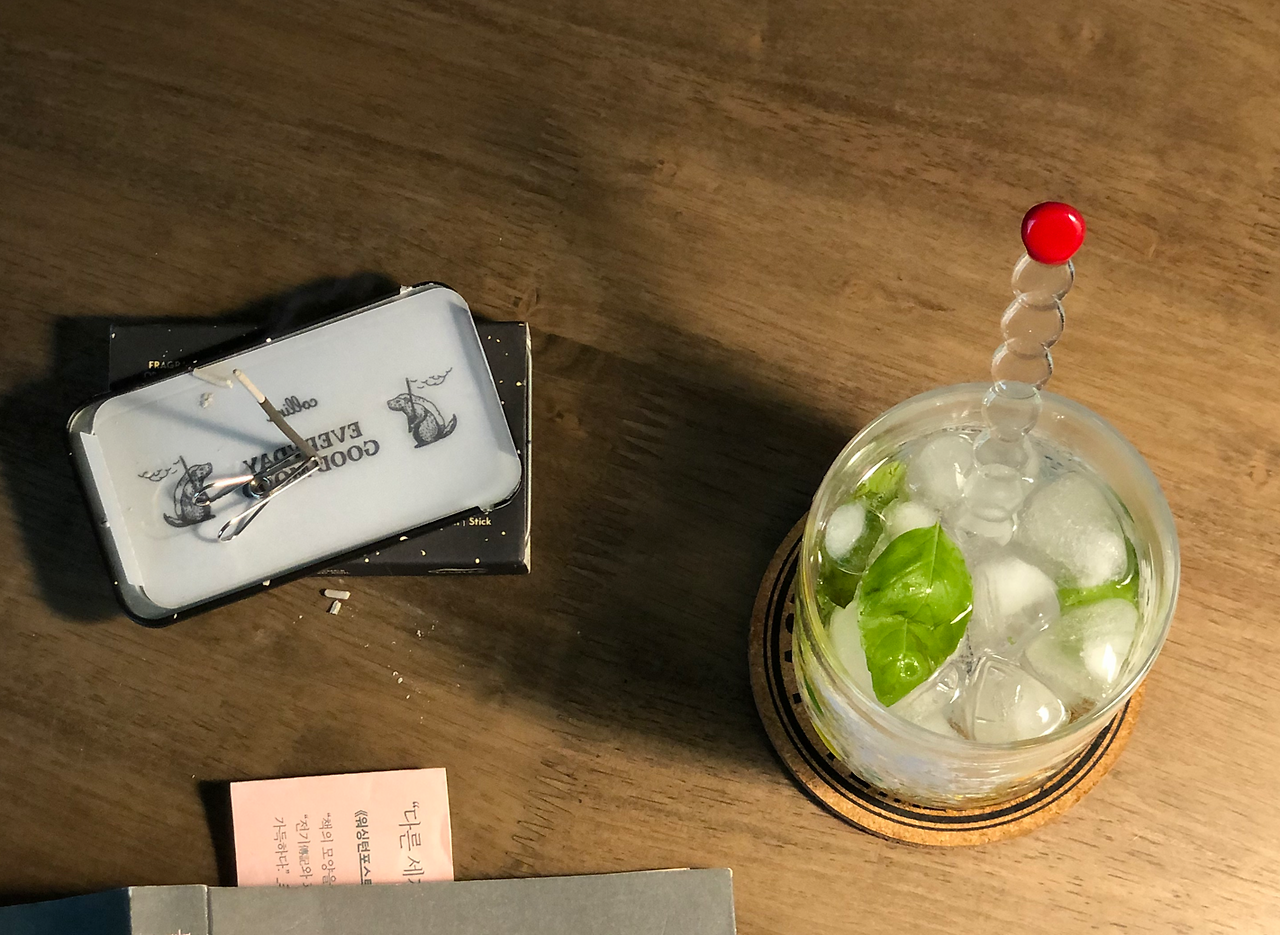 맵고 쓴 알코올 기운이 확 올라와 정신이 번쩍 든다. 소주를 들이켜기엔 그날따라 술맛이 너무 쓰디썼고, 그렇다고 홀짝이는 내 모습은 썩 멋이 없었다. 곁들여 먹을 거 뭐 없을까 하고 다시 냉장고를 열어보니, 구석에 숨어 있던 토닉워터가 눈에 들어온다. 그리고 내겐 아주 신선한 바질이 있다. 내 맘대로 칵테일을 만들어 마시자!