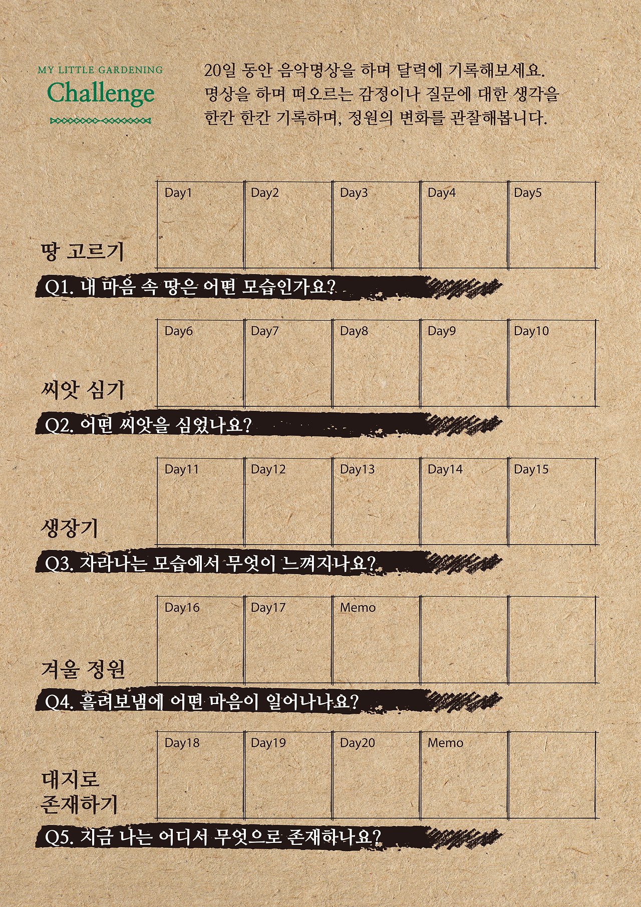 음악명상을 느끼며 감정이나 질문, 생각을 한 칸 한 칸 기록하여 마음속 정원의 변화를 관찰해 봅니다.