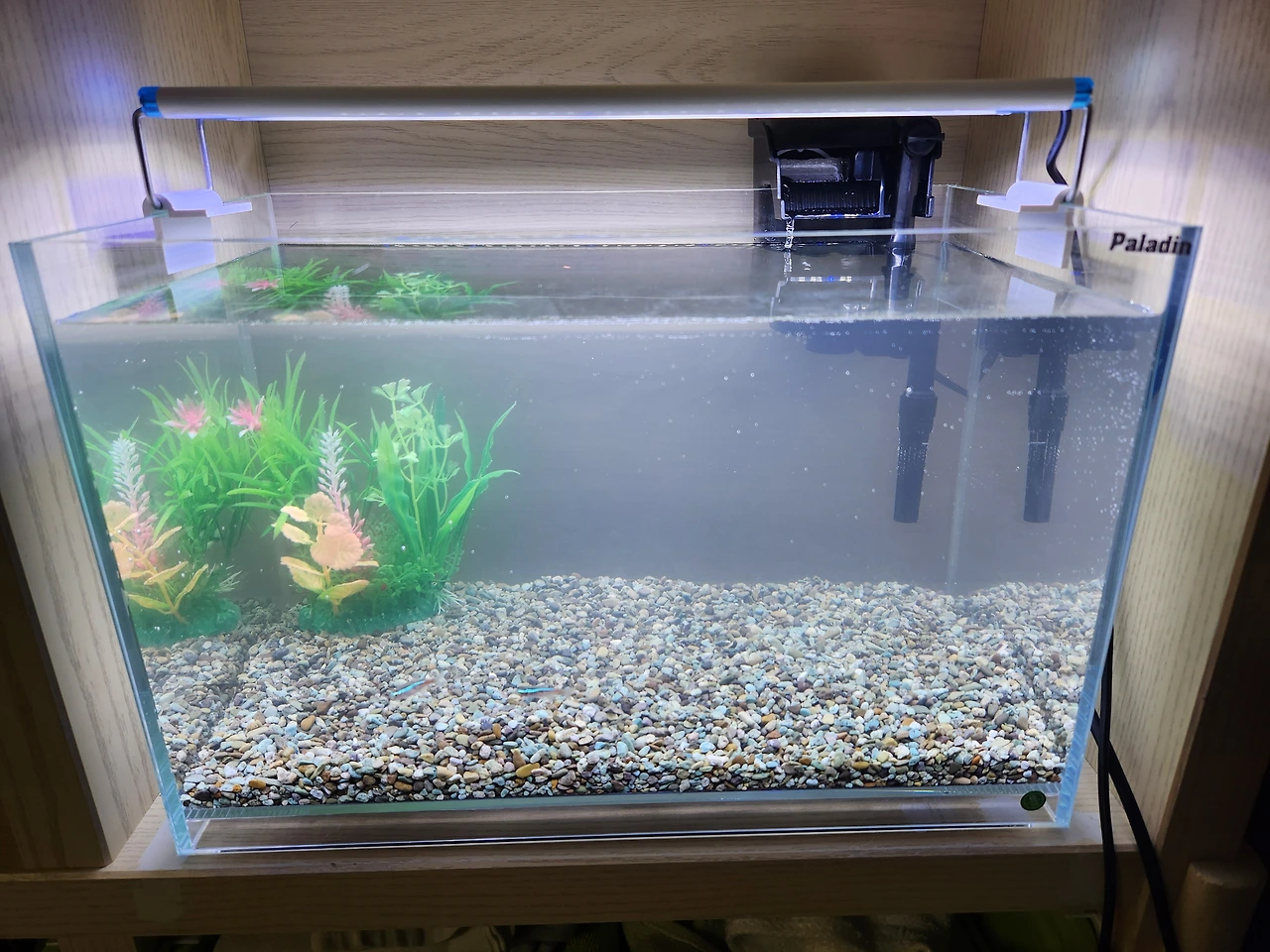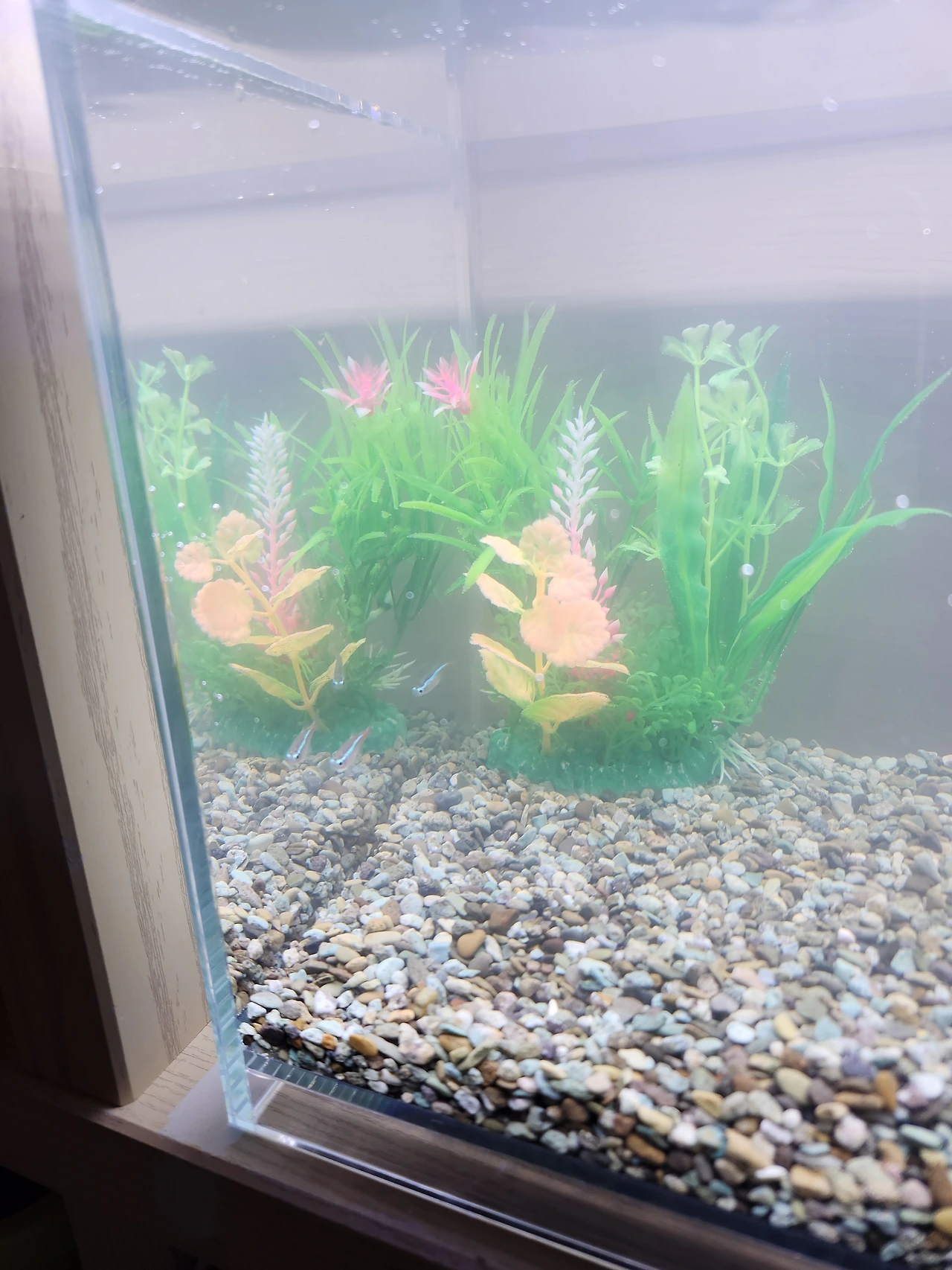 어린이날을 맞아 아이와 이야기한 후 우리는 물고기를 제대로 키워보기로 했다. 그리고 제대로 키우는 법을 1부터 10까지 다 배운 후에 수조와 여과기, 조명, 물을 갈아줄 때 필요한 도구까지 싹 다 사 왔다. 그리고 제일 중요한 물고기는 일단 구입처 사장님이 네온테트라 2마리를 주셨다. 물에 차츰 적응하는 방법을 배운 대로 철저히 지켜서 어항에 두 마리를 이름까지 지어서 넣어뒀는데 첫 물고기들은 죽을 확률이 높다고 하니 두고 보려 한다. (4일째 잘 살아있다!) 남편도 나도 물고기를 한 번도 키워 본 적이 없으니 우리 가족에겐 물고기가 생전 처음 들인 애완동물이다. 아무것도 모르고 보는 물고기와 알고 보는 물고기는 완전 다른 존재가 되어 버렸다. 이렇게 두 아기 물고기는 우리 가족이 되었다.