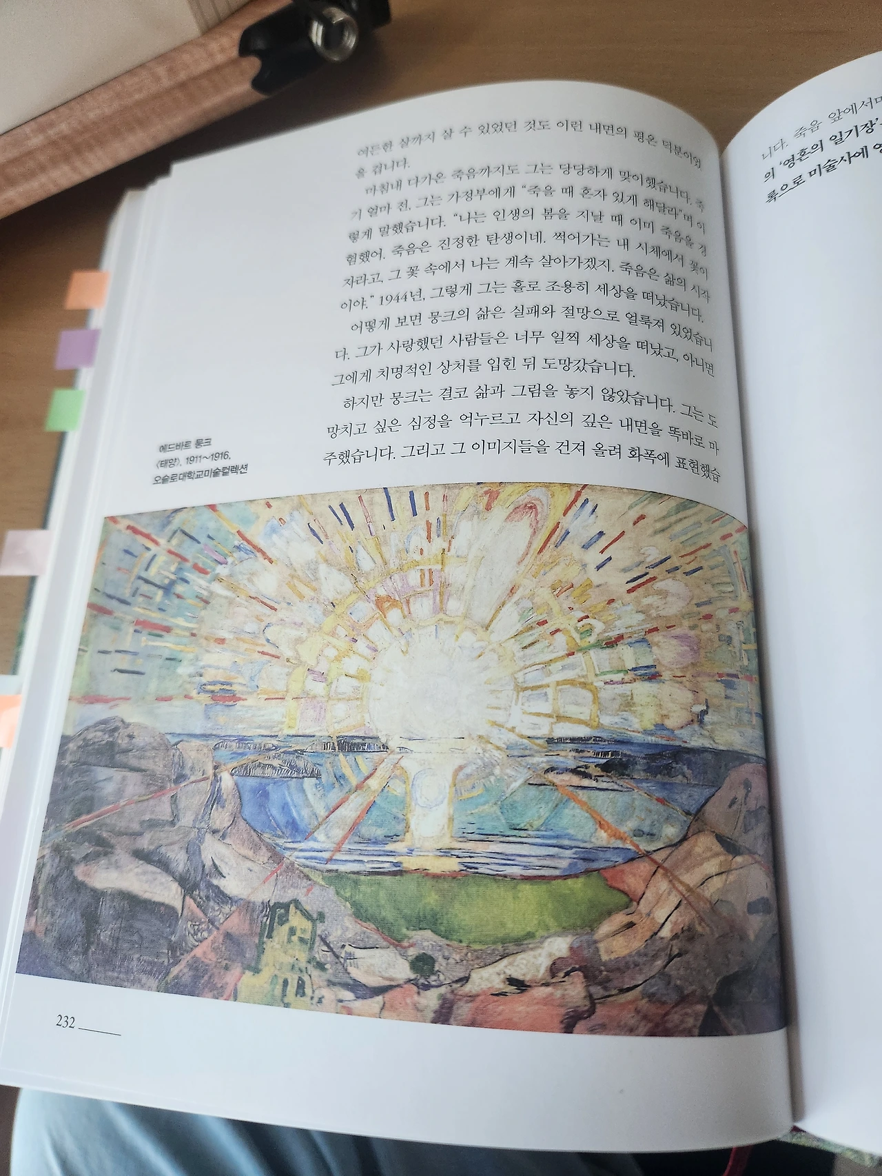 '유유자적 미술관'이라는 미술북클럽에서 미술책을 함께 읽고 있다. 북클럽장이 책을 몇 권 추천하고 그중에서 골라 두 달에 한 권정도 읽는다. 여유롭게 천천히 감상하듯 읽는 유유자적 북클럽이다. 1년에 한두 번 만나 함께 전시를 보러 가기도 한다. 책을 읽다가 문득 내 마음을 울린 문장만 필사할게 아니라 그림을 골라보자는 생각을 했다. 분명 내 마음을 울린 그림이 있을 텐데 너무 그림을 즐기지 않고 책을 본 것이 아닌가 하는 생각이 들었다. 북클럽 이름도 '유유자적'인데 난 왜 이리 마음의 여유가 없을까. 그래서 고른 작품이 에드바르 뭉크의 <태양>이다. 그동안 북클럽에서 읽었던 책들을 휘리릭 넘겨보다 내 마음에 들어온 그림이다. 뭉크 전시는 처음으로 유유자적 멤버들과 함께 본 전시이기도 하다. 태안에 다녀와서 이 그림이 내 마음에 들었을 수도 있고 실제로 바다에 뜬 태양이 이렇게 크고 찬란했는지 다시 한번 기억을 더듬게 된다. 이 그림은 오슬로대학교 벽에 그려진 작품이라고 한다.