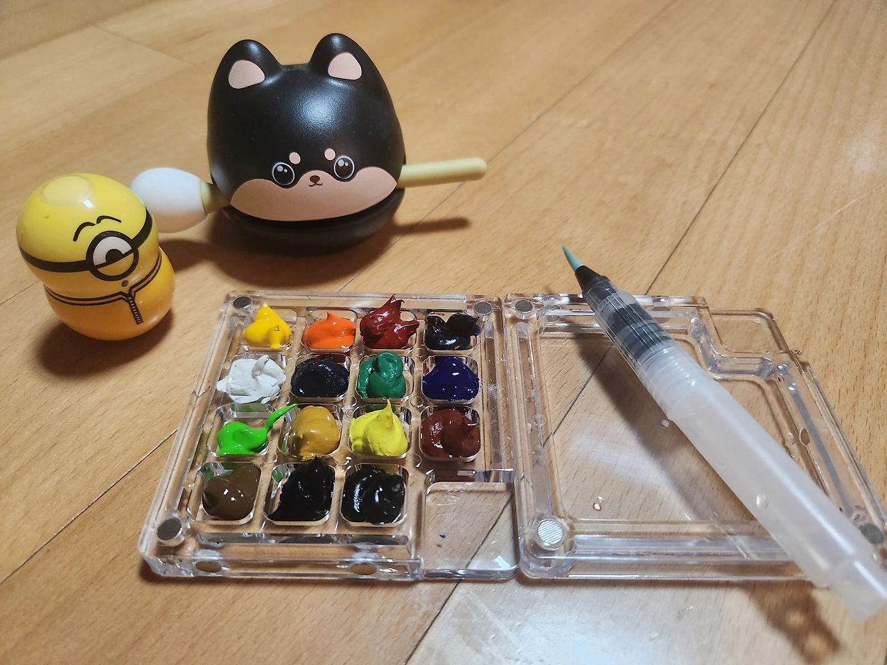 그리하여 또 폭풍검색을 해서 미니 팔레트와 미니 스케치북, 워터브러시 세트를 사고 말았다. 너무 미니미한 게 얼마나 귀여운지 한눈에 반해버렸다. 오자마자 아이와 함께 수채물감을 찾아 짜는데 수채물감도 몇 년 지나니 굳어서 잘 짜지지 않는다. 또 새로 살 때가 되었구나. 하하하. 이렇게 덕질은 계속된다.