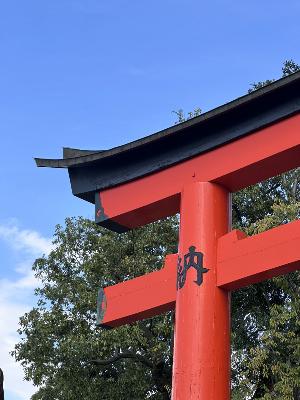 빨간 도리이 사이를 묵묵히 오르던 중, 한 남자를 만났습니다. 아마 서로 '혼자 온 여행객'임을 눈치챘겠죠. 우리는 자연스럽게 사진을 찍어주었고, 간신히 기념사진을 남겼지만 어색함이 가득했습니다.
