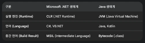 자바 기반의 프레임워크인 스프링 위에서 어떻게 코틀린이 주력 언어로 사용될 수 있을까? 그 답은 **JVM(Java Virtual Machine)**의 동작 원리에 있다. 이를 C# 개발 환경과 비교하면 이해가 쉽다.